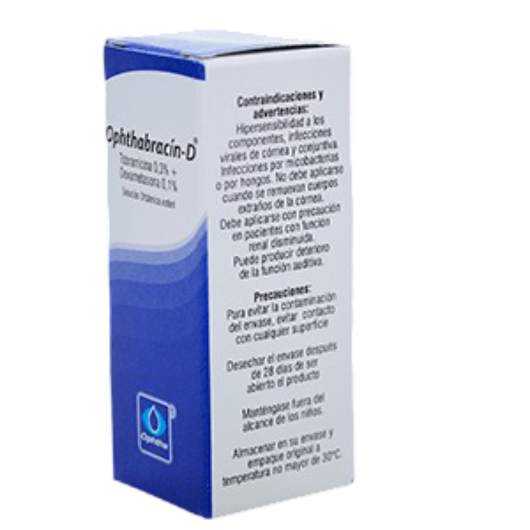 Opthabracin D es una solución oftálmica antibiótica y antiinflamatoria formulada con Tobramicina 0,3% y Dexametasona 0,1%, indicada para el tratamiento de infecciones oculares bacterianas acompañadas de inflamación. Su combinación actúa eficazmente eliminando bacterias sensibles mientras reduce el enrojecimiento, la hinchazón y las molestias oculares.