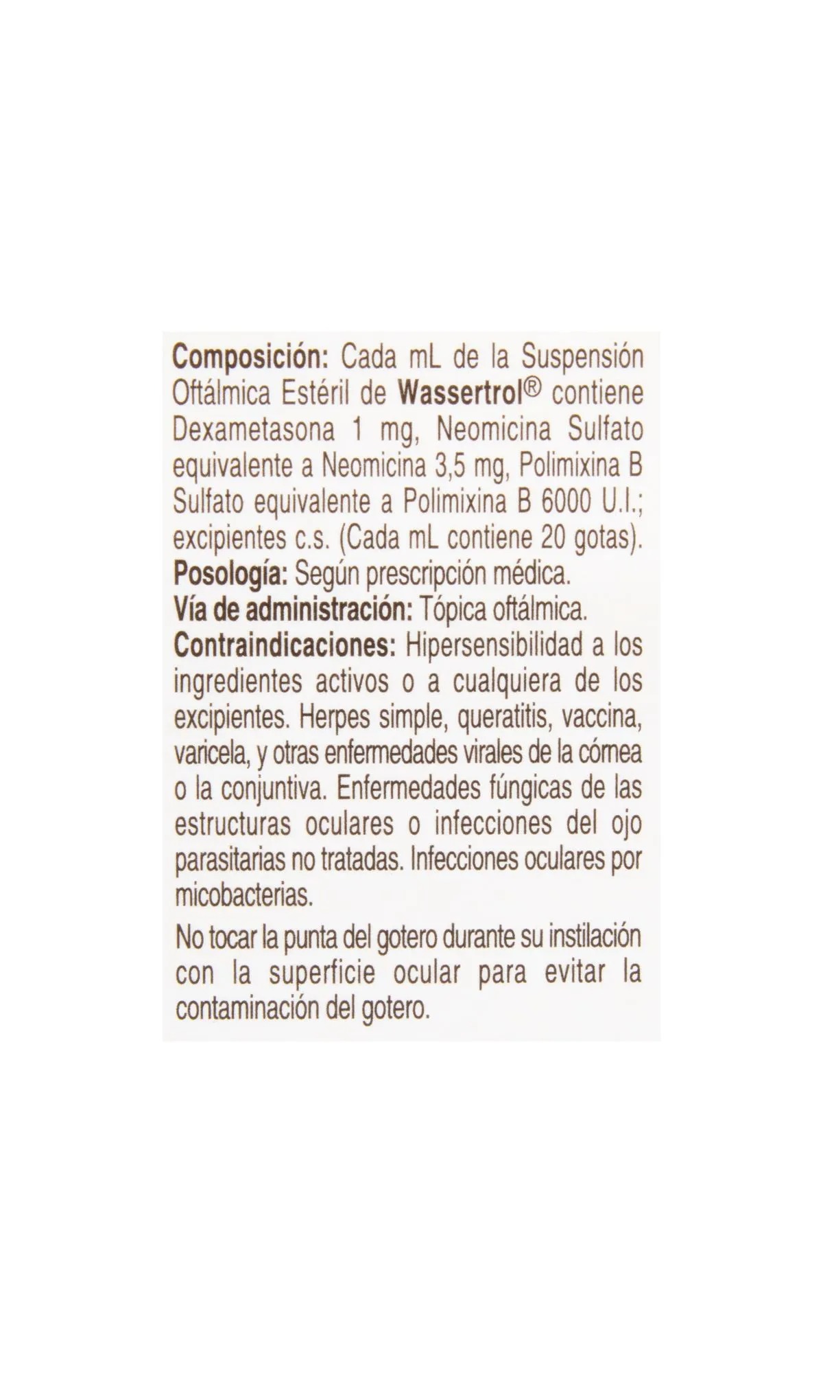 Wassertrol es una solución oftálmica indicada para el tratamiento de la sequedad ocular, proporcionando hidratación y alivio de la irritación y la sensación de cuerpo extraño. Su fórmula está diseñada para restaurar la humedad natural en la superficie ocular, mejorando la comodidad y reduciendo los síntomas de ojo seco causados por factores ambientales como el aire acondicionado, el uso prolongado de pantallas o condiciones de baja humedad.